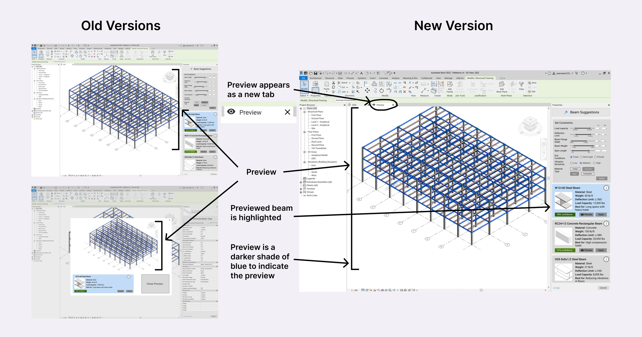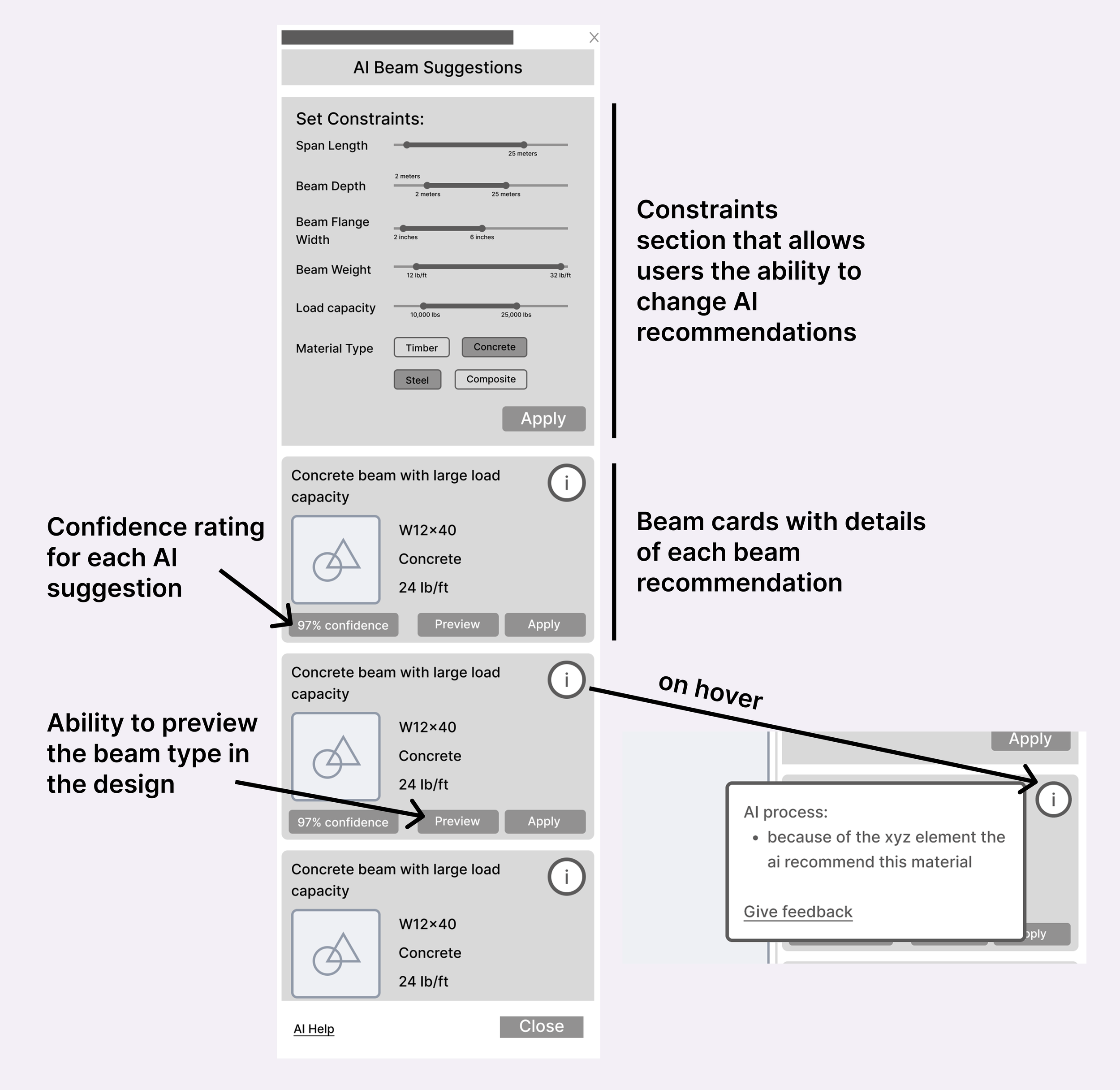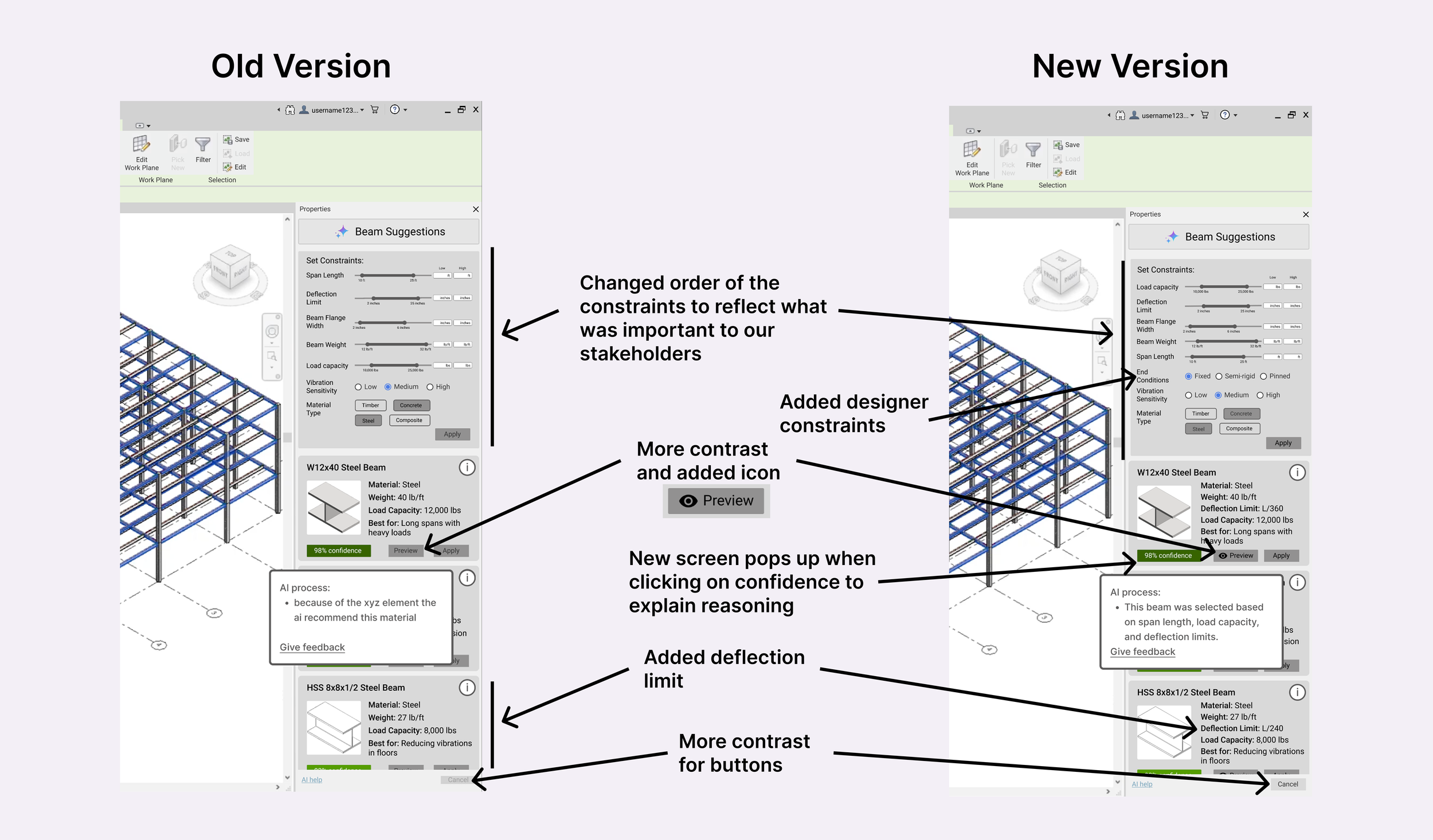 During our user testing, one of our users specifically brought up that they feel that ‘Load Capacity’ is one of the most important constraint so we rearranged our constraints to reflect this. Another participant pointed out that ‘Deflection Limit’ would be helpful to add to the beam recommendations cards. Additionally, we noticed our stakeholders had a hard time finding the preview button, so we added an eye icon next to the preview button so that it could stand out more. Additionally, we generally made our components more consistent.