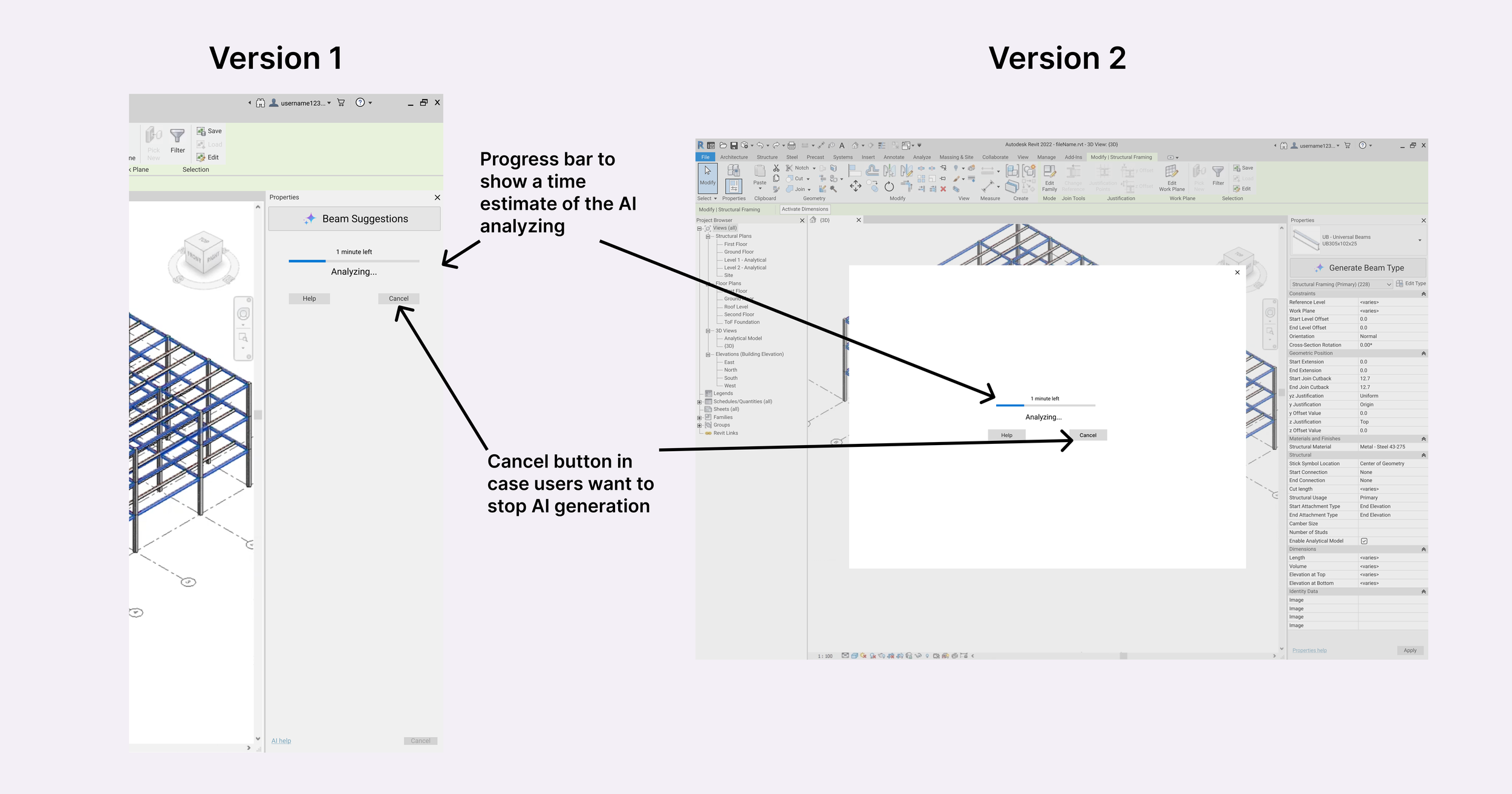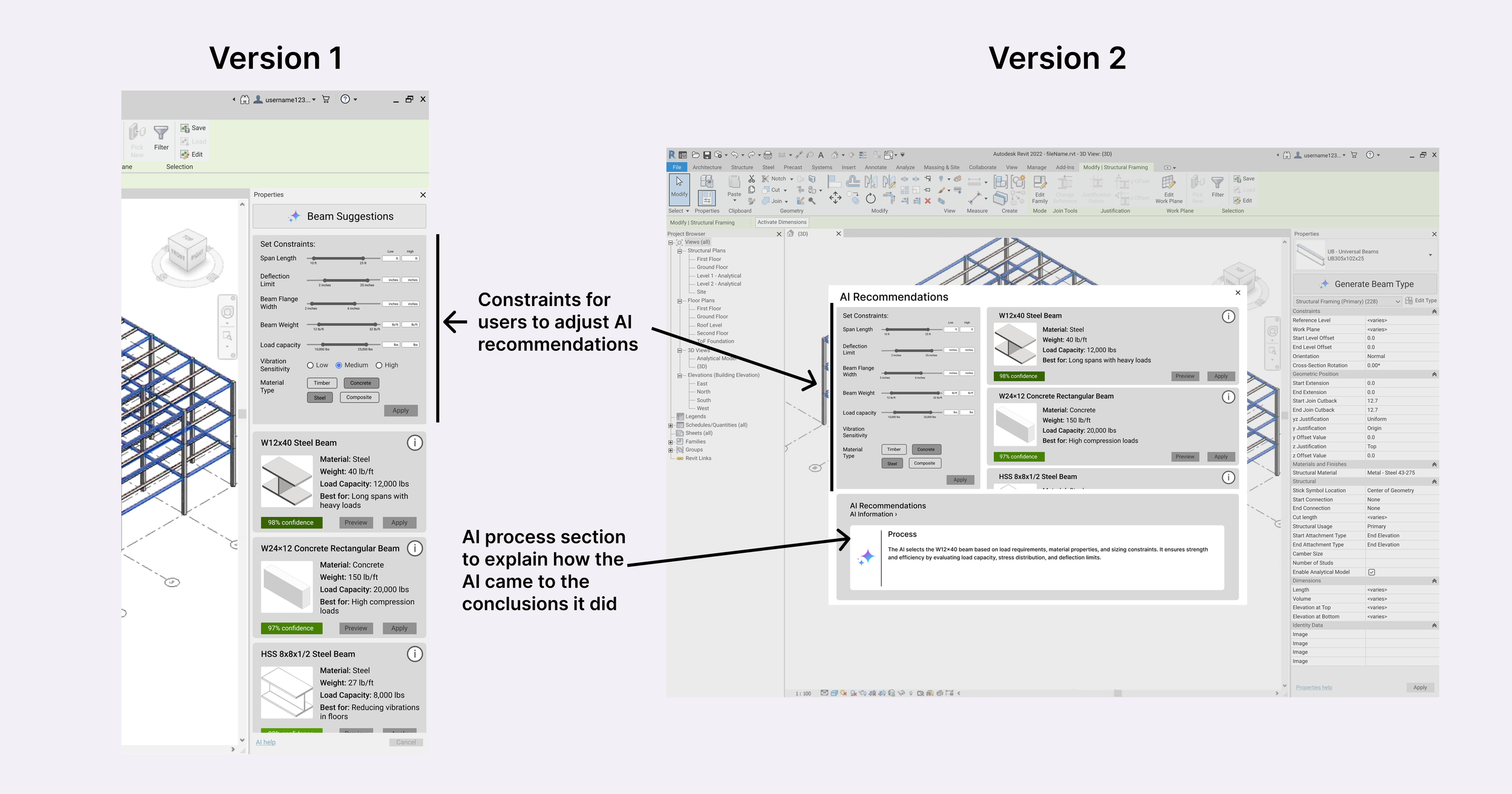 We explored how civil engineers worked to use various platforms to design and test buildings. By implementing an AI-assisted beam suggestion tool, we helped engineers reduce time spent on routine calculations while maintaining full control over critical design decisions.