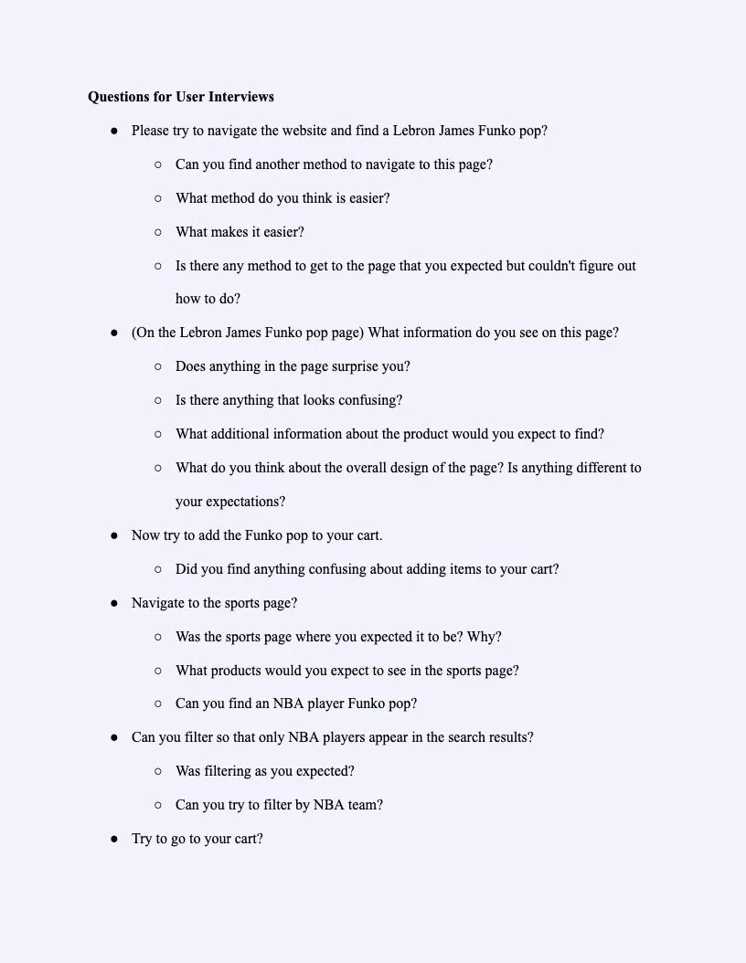 Developed 43 usability-focused questions across 4 categories: Introduction, Navigation, Purchasing, and Wrap-up