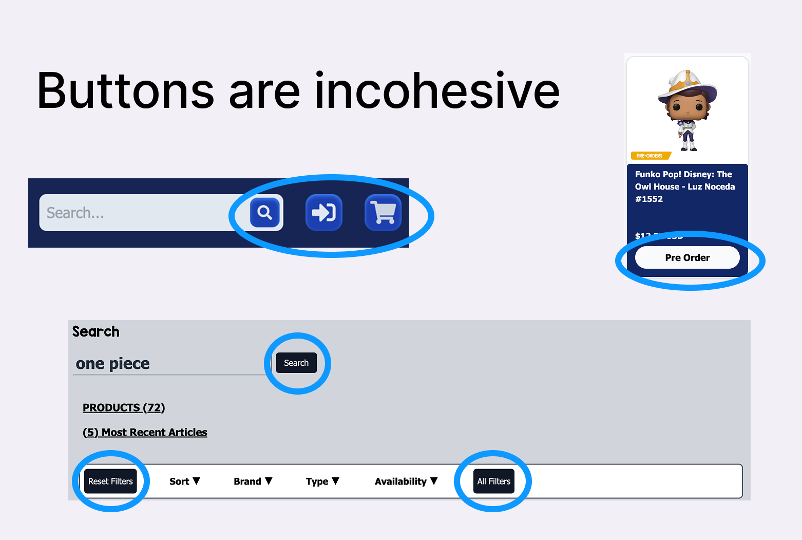 We found that users had trouble navigating through the website. For example, multiple users (3) had trouble finding the preorder button because it was small and slightly hidden. One user couldn’t figure out how to pre order items from the product page at all and instead went back and clicked on the button from the product card.